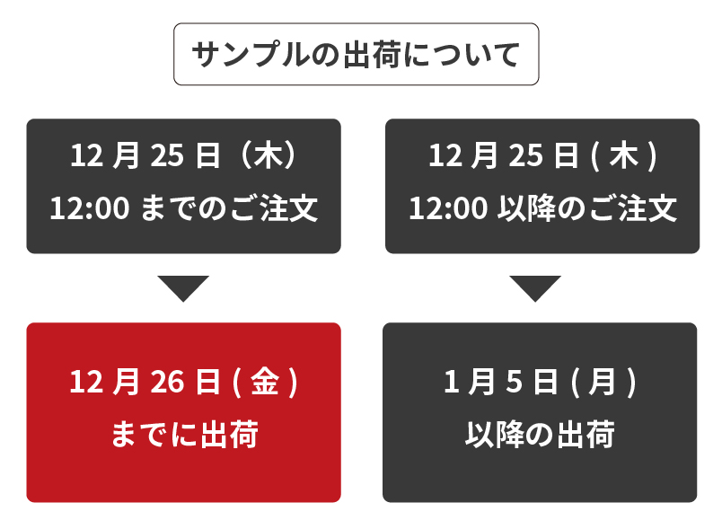 ※入れ違いでサンプルが欠品中の場合や、発送点数が多いご注文については、休業明けの出荷となる可能性がございます。