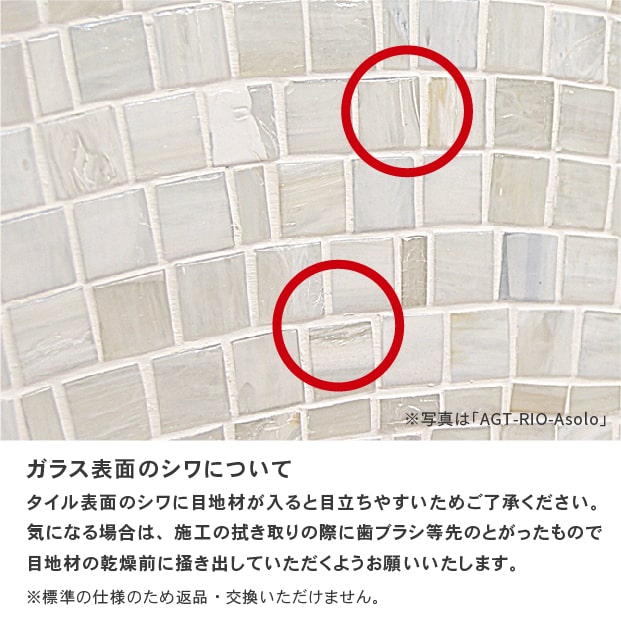 ○ガラスタイルは非常に色合いが繊細なため、モニターの画像ではとくに色味を再現しづらい商品です。ご検討の際は必ず先にサンプルをご請求ください。またガラスの透過性により、目地を入れると色味や模様の見え方が変わることがありますので、ご不安の場合は事前に1シートご購入のうえ、目地を入れて実際の仕上がりをご確認頂く事をおすすめいたします。