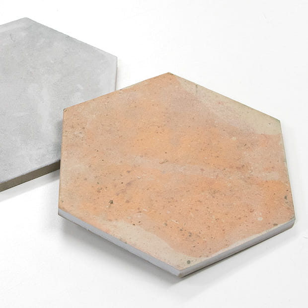 テラコッタ風のプリントを施したスペイン産の六角形タイルです。素材の風合いを再現し、室内を優しい雰囲気に仕上げます。
