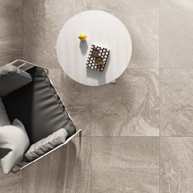 天然石を模した品のある大判タイル。ラフ面のため滑りにくく、玄関の内外で使用可能です。