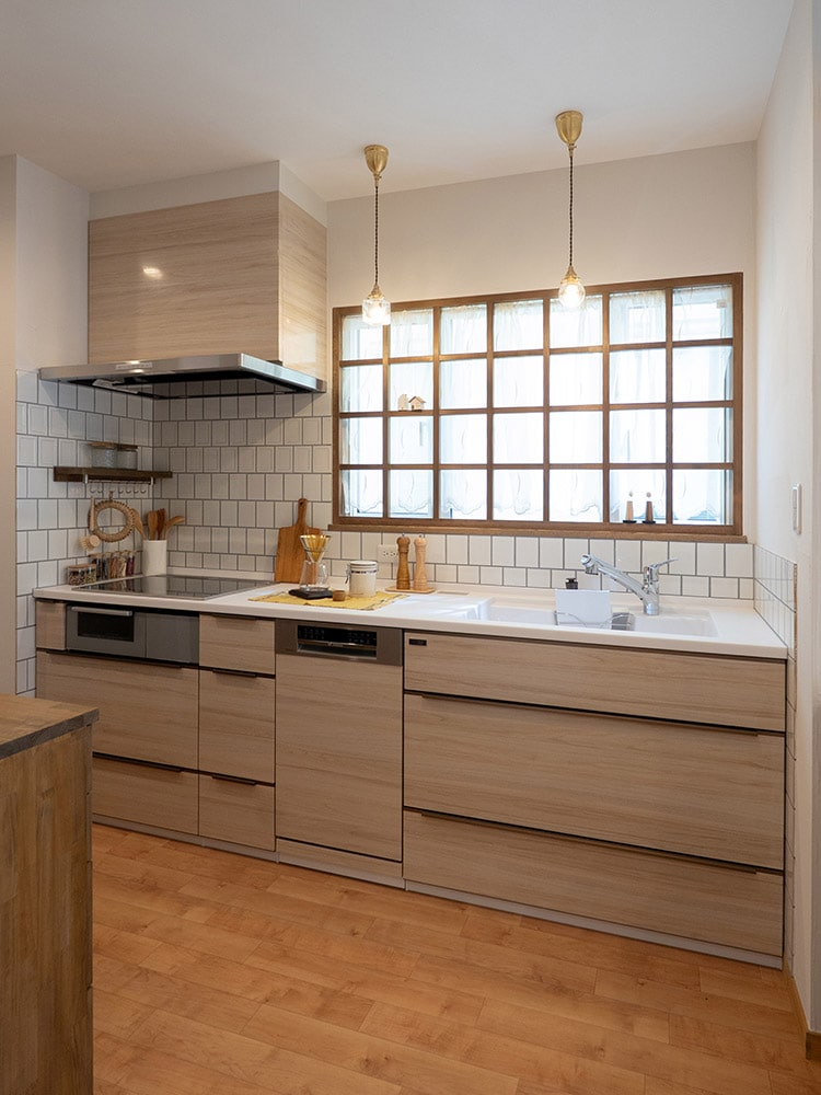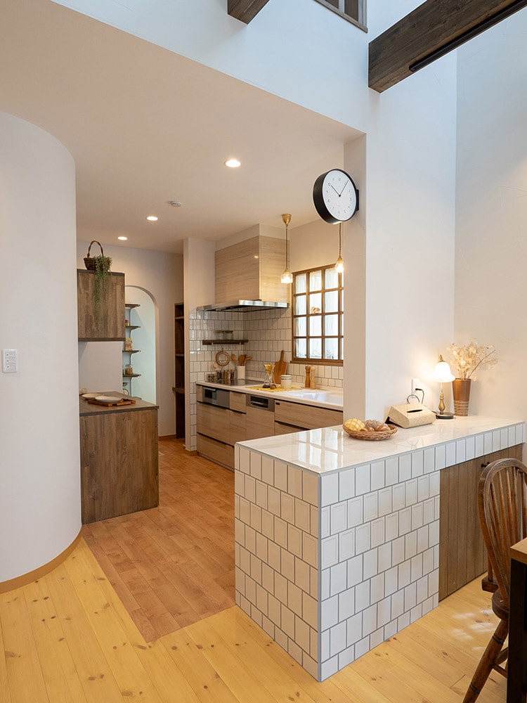 たっぷりとタイルを使った明るく上品なキッチン