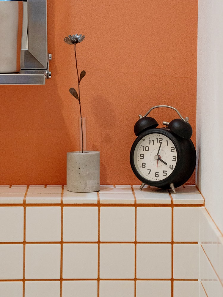アメリカン×インダストリアルがテーマのこちらのお家は、オレンジの塗り壁に合わせてオレンジのカラー目地で仕上げることで、ホワイトシリーズのシンプルで飽きの来ないデザインが際立つ洗面スペースに仕上がっています。