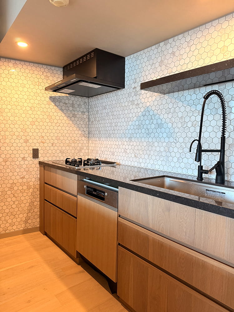 大理石のモザイクタイル「ラフィニタ」で仕上げた、キッチン施工例。ヘキサゴン(六角形)の連続性が、空間に心地よいリズムを生んでいます。