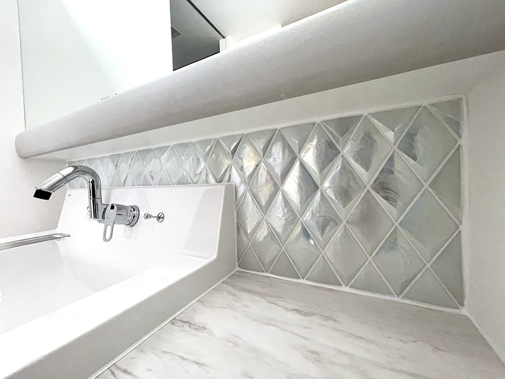 塗り壁に合わせたカラー目地が映える洗面台