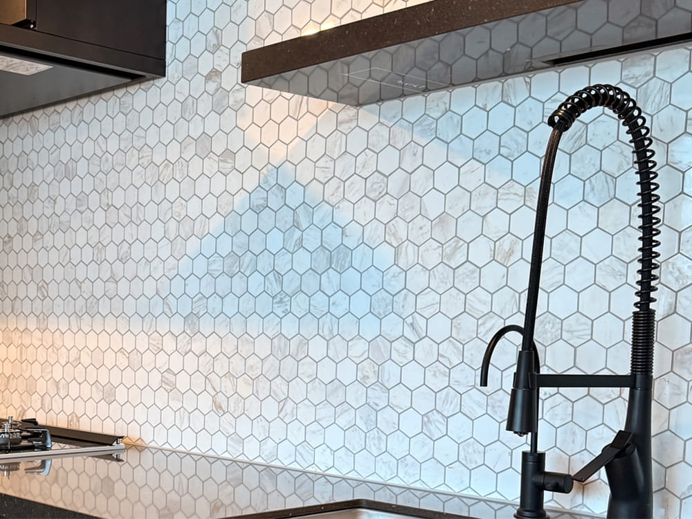 白タイル×黒目地でメリハリのあるキッチンに