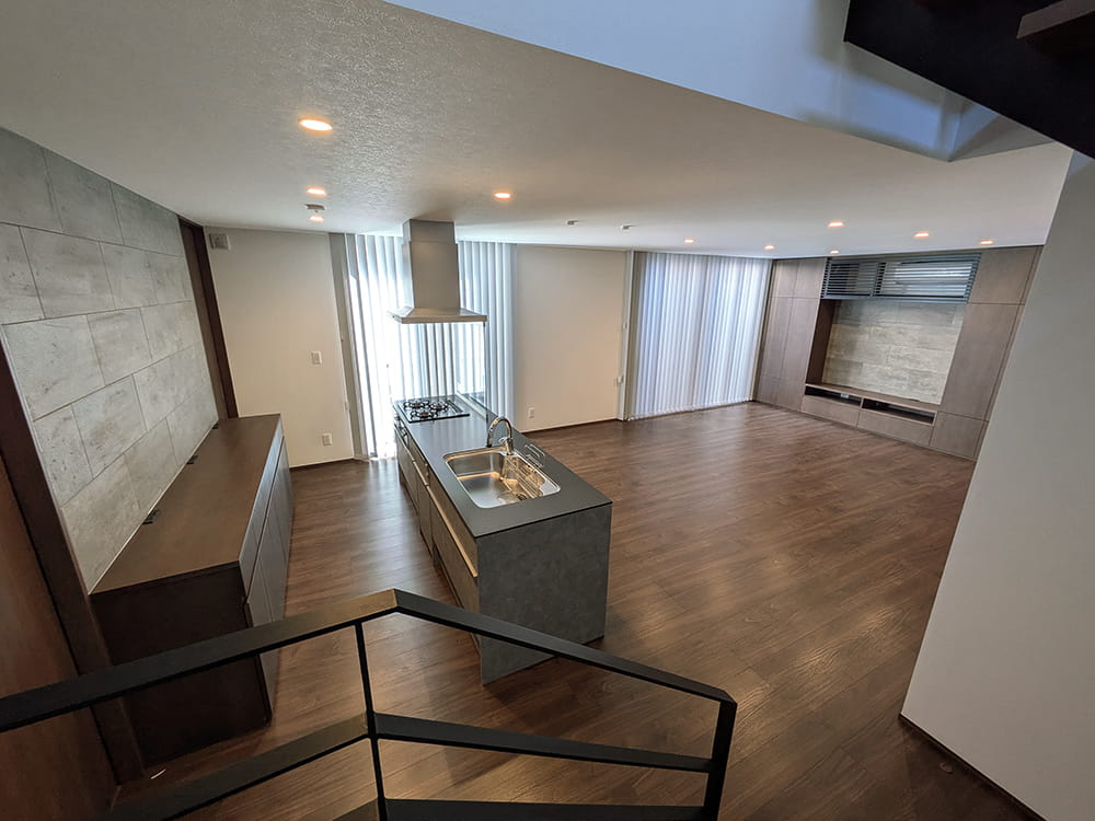 大判タイルで魅せる壁。広がりと高級感のあるLDK