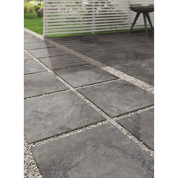 駐車場にも使用可能な20mm厚の屋外床用タイル。石調の模様が高級感を演出します。