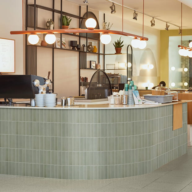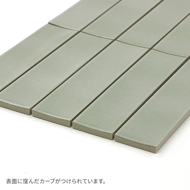 僅かに凹みのカーブがつけられたタイルの面状に、空気に溶けこむようなセミマットな質感の釉薬が施され、ほのかに温かみを感じる空間に。ナチュラル系インテリアや質感重視のインダストリアルな空間デザインを支えます。
