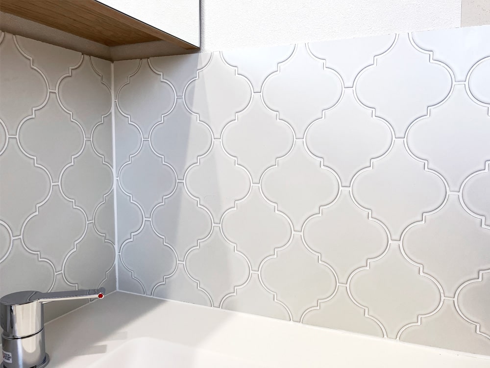 形がとても目をひくランタン型のタイルですが、白い壁面にタイルも白をチョイス。目地も白でシンプルに仕上げ、やわらかな曲線がかわいらしくも上品な雰囲気にまとめられています。