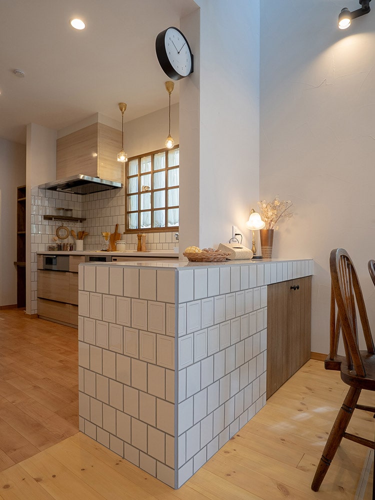 たっぷりとタイルを使った明るく上品なキッチン