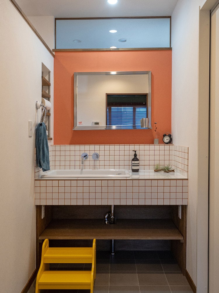 アメリカン×インダストリアルがテーマのこちらのお家は、オレンジの塗り壁に合わせてオレンジのカラー目地で仕上げることで、ホワイトシリーズのシンプルで飽きの来ないデザインが際立つ洗面スペースに仕上がっています。